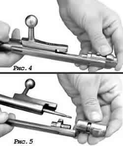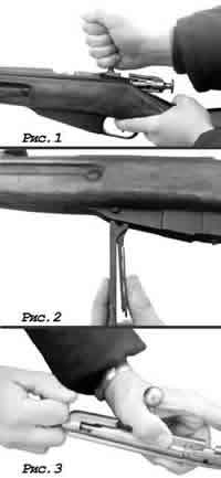Откройте затвор и осмотрите патронник и магазин. Затем, нажимая на спусковой крючок указательным пальцем левой руки, правой рукой извлеките затвор из ствольной коробки (рис. 1). На конце шомпола есть резьба для ввинчивания в шомпольный упор. Вывинтите и вытащите шомпол. Отделите крышку магазинной коробки — нажимая пальцем на головку защелки, откройте крышку. Сожмите подающий механизм и снимите крышку с шарнирного болта (рис. 2).