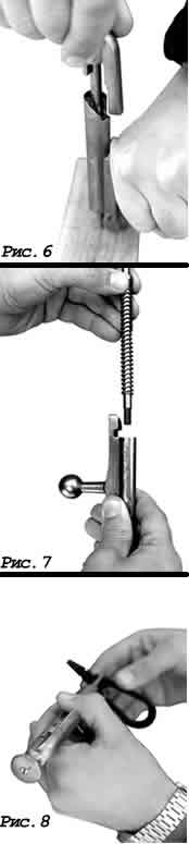 взявшись за пуговку курка, оттяните его на себя и поворачивайте до тех пор, пока не услышите характерный звук щелчка. При этом сосок курка должен войти в выемку, расположенную на стебле затвора. Вот и все. Мы надеемся, вы поняли, что разборка и сборка затвора — это всего лишь "ловкость рук и никакого мошенничества". Дальнейшая сборка винтовки не составит для вас ни малейшего труда. Она осуществляется в обратном порядке. Присоедините крышку магазинной коробки с подающим механизмом к магазинной коробке. Прижав подающий механизм к крышке, наденьте ее вырезом на шарнирный болт и закройте крышку.