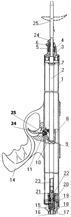 При сборке гарпуна придерживаются следующей последовательности. На стержень гарпуна (23) устанавливают скользящую втулку (24) и навинчивают наконечник (25). Заднюю часть гарпуна располагают в ружье, центрируют скользящей втулкой в направляющей (4) передней крышки.