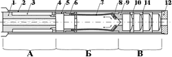 А —Ствол Б —Камера предварительного расширения с клапаном В —Участок вихревых камер |