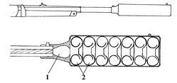 В Европе изобретатель Э. Тирлер в 1911 г. получил патент на систему, отличающуюся от глушителя Максима. Сама конструкция глушителя (рис. 3) была эксцентрическая и имела внутри корпуса еще две трубки. Одна проходила вдоль оси канала ствола и содержала двенадцать конических преград, узкой частью направленных к стволу. При этом поток пороховых газов разделялся и направлялся к стенкам трубки. Вокруг второго — пятого корпусов, считая от ствола, в стенках трубки были выполнены отверстия, сквозь которые пороховые газы проходили в другую трубку, внутри которой находилась первая. Особенностью конструкции являлось то, что первая порция газов, следовавших перед пулей и за ней, попадая в эту трубку, резко расширялась и, двигаясь вдоль нее по ходу выстрела, попадала уже в корпус самого глушителя через множество мелких отверстий, сосредоточенных в передней части стенки трубки. Корпус был заполнен металлической сеткой и мелкой стружкой из меди или латуни — материала, хорошо отводящего тепло. Пройдя в корпусе в обратном направлении через эту последнюю преграду, газ стравливался в нижней задней части глушителя.