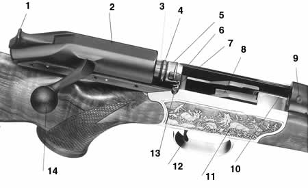 R 93 с открытым затвором:1 — ползун взведения; 2 — затвор; 3 — цанговые пропилы; 4 — раздвижная втулка; 5 — головка затвора; 6 — выбрасыватель; 7 — отражатель; 8 — магазин; 9 — посадочное место затвора; 10 — патронник; 11 — ствольная коробка: 12 — спусковой крючок; 13 — блокиратор затвора; 14 — рукоятка затвора |