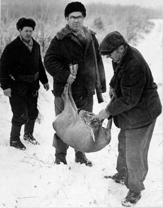 В тот год приехали мы к Василю Омельковичу по направлению с лицензией на козу в конце декабря. Нас было девять охотников. Два крепких брата Ивановичи: Иван Иванович — лет сорока пяти, выше среднего роста, оборотисто-напористый и удачливый, почти всегда с дичью, говорит дельно, отрывисто; Виктор Иванович — младше Ивана на три года, весельчак, непоседа и балагур. Наш председатель — Александр Николаевич, с широким добродушным лицом, в очках, всегда приветливо улыбается (левая рука у него повреждена, но стрелок он классный). Эдуард Викентьевич — широкоплечий, высокий, подтянутый, средних лет, в зеленой фуражке вроде конфедератки. С ним Бой — рослый фокстерьер. Под стать Эдуарду Викентьевичу, но моложе, его друг Володя с мощным ножом на поясе в самодельных кожаных ножнах. Жора — среднего роста, чернявый, спокойный, молчаливый, лет тридцати. Стас — лет сорока пяти, среднего роста, в кожухе и лётном шлеме, смотрит пытливо широко открытыми глазами, скульптор. Мой отец — жизнерадостный, общительный, почти пенсионер, преподаватель. Я — молодой специалист. Кроме Володи, Виктора Ивановича, Стаса и меня, все остальные — сотрудники КПИ.