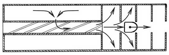 Отличительной чертой этой группы глушителей является ствол с газоотводными отверстиями, выполненными в стенках канала. Через них часть пороховых газов отводится в глухую расширительную камеру, расположенную вокруг ствола. Таким образом, глушитель образует со стволом одно целое, т. е. интегрирует с ним — отсюда и соответствующее название (рис. 1). Отвод пороховых газов непосредственно из канала ствола, способствует снижению скорости пули патрона до пределов дозвуковой. При этом возрастание скорости пули в канале ствола происходит только до газоотводных отверстий, таким образом, рассчитав расстояние, отделяющее их от патронника, можно получить искомую величину скорости. Оставшаяся часть ствола выполняет роль направляющей, обеспечивающей оптимальную стабилизацию полета пули. Подытожив сказанное выше, можно сделать вывод: такая конструкция глушителя позволяет уменьшить общую длину оружия, что улучшает его эксплуатационные характеристики. Вариант практической реализации этой конструкции представляет собой комбинацию оружия с дульной насадкой, которая составляет вторую часть такого глушителя, выполненную в общем со стволом корпусе (рис. 2). При этом падение давления пороховых газов уже в стволе оружия позволяет реализовывать в надульной части наиболее простые варианты глушителей, что упрощает технологию их производства в военное время.