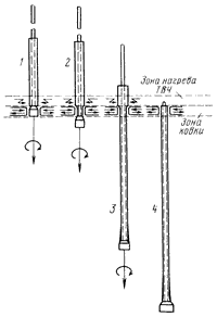 1 — разогрев токами высокой частоты перед ковкой;2 — начало ковки;3 — процесс ковки;