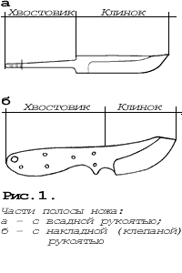 Ножи любого типа состоят из двух основных частей: полосы ножа и рукоятки (рис. 1). От формы, пропорции, размеров, материалов клинка и рукоятки, от закалки и заточки лезвия, а также от отделки зависят удобство в обращении и красота ножа.