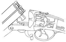 Весьма остроумный способ взведения ударного механизма бескуркового ружья изобрел Фредерик Бизли, но патент, очевидно, приобрел англичанин Джеймс Перде, потому что лишь он выпустил такое ружье. Курки в ружье взводятся силой верхнего пера боевой пружины. Для этого оно имеет значительное утолщение (выступ). При открывании ружья верхнее толстое перо пружины, освобождаясь от давления рычага, взводит курок на боевой взвод. При закрывании ружья боковая пружина нагнетается сверху вниз, увеличивая тем самым давление на курок. Механизм простой, надежный и безопасный. Предохранитель можно поставить любой, но только запирающий спуски. Затвор ружья Перде устроен на двух нижних крюках без верхнего скрепления. Такие затворы, не расшатываясь, служат очень долго. Это еще раз доказывает, что хорошо изготовленная рамка системы Перде является очень прочной и надежной системой запирания. Высококлассная работа оружейника Перде гарантировала ружьям долговечность и безопасность применения. |