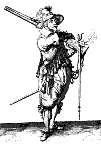 Внушительный вес аркебуз и мушкетов и чувствительная отдача при выстреле заставляли использовать их со специальной вилкообразной сошкой высотой 120-135 см, называемой форкетом, и надевать на плечо мягкую кожаную подушку. Не каждый солдат мог стать мушкетером. Для этой цели подбирали наиболее сильных и крепких людей. Снаряжение мушкетера было от-нюдь не из легких. На поясе висел кожаный мешок, в котором помещалось до трех десятков свинцовых пуль, отливаемых им собственноручно. Через левое плечо была перекинута широкая перевязь - бандельера из дубленой кожи, где на шнурах располагались 12 мерок - 11 с заранее отмеренными зарядами пороха и одна с пороховой мякотью для передачи огня пороховому заряду в стволе. Здесь же висели фитили длиной до одного метра. Запас пороха, носимый мушкетерами, размещался в большой деревянной пороховнице, обитой толстой кожей.