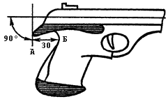 Разрешены искривленные контуры рукоятки и задней части рамки пистолета в направлении оси оружия (рис. 7). ж) задняя часть рамки пистолета, которая опирается на кисть между основаниями большого и указательного пальцев, не должна выступать более чем на 30 мм. Это расстояние измеряется между точкой А на линии, перпендикулярной оси канала ствола, и точкой Б — на контуре рукоятки (рис. 7).