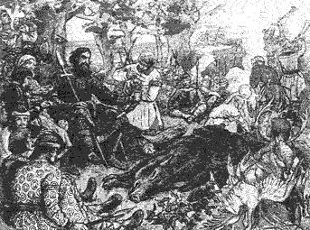 Охотой занимались все, от безвестных Иванов и Степанов до великих князей, царей и императоров. Надо сказать, что не всегда вельможи наслаждались поэзией и музыкой псовой охоты или изысканностью охоты соколиной: изображенный на картине В. Васнецова киевский князь Владимир Мономах сидит у поверженного им громадного вепря с рогатиной в руках. Да, с самой обычной рогатиной, с каковой и после Мономаха несколько столетий хаживали на лютого зверя русские цари и российские императоры.