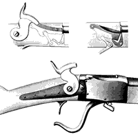 Она состоит из подвижного щитка, закрывающего патронники и откидывающегося назад на горизонтальной поперечной оси, расположенной ниже казенного среза стволов, рычага, который подпирает этот щиток в закрытом состоянии, а также ключа затвора, расположенного под спусковой скобой. При подаче последнего вперед-вниз рычаг ключа выступами короткого плеча скользит по копирной поверхности рычага запирания, заставляя его передний конец опускаться, в то время как задний конец, поворачиваясь на полушарнирах внутри колодки, взводит внутренние курки. Пластинчатые пружины курков лежат вдоль личинки спускового механизма. Передний конец рычага запирания, опускаясь, натыкается на выступ щитка и заставляет его отклоняться назад. Таким образом, каналы патронников открываются для заряжания либо для замены патронов. Передний зуб щитка взаимодействует при его отклонении с экстрактором обычного типа, и гильзы (или патроны) выталкиваются из патронников на 4–6 мм (рис. 5).