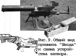 Более поздними примерами использования подобной системы можно считать пулеметы "Шкода" образцов 1902–1913 гг. (Австро-Венгрия). В основу автоматики этих пулеметов (рис. 9) положен очень похожий на систему Таннера принцип запирания. Практически единственное отличие заключалось в том, что в пулемете подпирающий рычаг не фиксировал щиток наглухо, а после очередного выстрела сползал по специально устроенному скосу. В целом система запирания оружия в таком варианте представляла собой реализацию идеи полусвободного затвора. К недостаткам системы Таннера, которые, собственно, и помешали ее широкому распространению, можно отнести слишком тугое открывание ружья рычагом ключа затвора, что является результатом тугих боевых пружин. В свою очередь, пружины пришлось сделать такими жесткими для устранения возможности осечек, которые