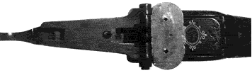 Итак, общие характеристики ружья. Это двуствольное ружье с горизонтально спаренными стволами 16 калибра. Стволы отъемные, после установки на колодку фиксируются путем поворота специального подствольного рычага колодки в продольное положение (рис. 1). В таком виде это устройство накрывается цевьем, которое имеет защелку с кнопкой на переднем конце. Ружье было изготовлено, если судить по единственному найденному на стволах и колодке германскому клейму, свидетельствующему об испытании готового ружья, примерно в 1880–1890 гг. Насеченная золотом надпись на прицельной планке называет нам имя оружейного мастера: "Отто Титтер в Легнице" (otto titter in liegnitz) (рис. 2), а на верхней крышке подвижного затвора указано название системы —"Система Таннера" (system tanner) (рис. 4 и фото на цветной вкладке). На правом стволе видна надпись "Прима Английская" (prima englisch). Написание слов liegnitz и englisch, да и само имя изготовителя otto titter говорят, скорее всего, о немецком происхождении оружия. В данном случае речь может идти о мастере, работавшем недалеко от Бреслау на тогдашей немецкой территории (сейчас это Польша, а сама Легница — небольшой город вблизи Вроцлава).
