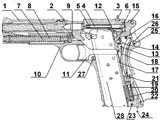 Подача патронов производилась из однорядного магазина емкостью 8 патронов, удерживаемого в рукоятке защелкой, размещенной с левой стороны рамки за спусковой скобой. Пистолет снабжен наружным курком, взводящимся большим пальцем или упором в бедро. Вероятность случайного выстрела при срыве курка во время взведения практически исключалась благодаря использованию зуба предохранительного взвода курка. Спусковой механизм действовал только после полного запирания оружия. Рычажок освобождения курка, размещенный на затворе с левой стороны, позволял спустить взведенный курок при заряженном оружии без производства выстрела. Использование инерционного ударника предотвращало упор бойка в капсюль патрона при спущенном курке. В этом положении пистолет был безопасен для ношения и приводился в боевое положение лишь посредством взвода курка. За счет использования рукояточного предохранителя стрелять можно было только после правильного охвата рукоятки ладонью.