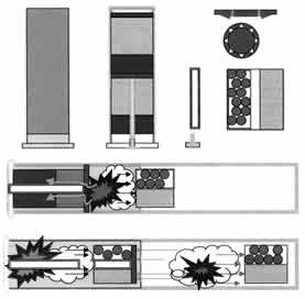 В это время, с промежутком в доли миллисекунд, подобное происходит и с пороховым зарядом, расположенным в нижней части гильзы. При этом контейнер со сквозным отверстием, проходя по каналу ствола, деформируется и, непроизвольно сужаясь, перекрывает сквозное отверстие. В результате происходит два раздельных выстрела.