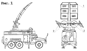 На шасси второго автомобиля размещено оборудование станции, которое и обслуживает боевой расчет.На крыше кузова(рис. 1) расположены четыре антенных системы метрового, дециметрового и сантиметрового диапазонов волн с узкой диаграммой направленности — 1 (для контроля "дальней" зоны) и с широкой диа-граммой направленности — 2 (для контроля "ближней" зоны).