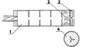 1 — корпус; 2 — мембрана; 3 — войлочный наполнитель; 4 — мембрана с тремя разрезами. Вид спереди |