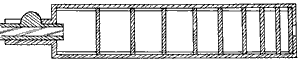 Все эти образцы представляли собой опытные экземпляры, выпускающиеся малыми сериями. Немецкие специалисты разработали глушитель к карабину "Mauser-98-k", взяв за основу конструкцию "Брамита" и изменив параметры посадочного места под размеры своего оружия. Гильза немецкого патрона с уменьшенной навеской пороха окрашивалась ярко-зеленым лаком. Существовало и несколько более сложных конструкций. Один из таких вариантов состоял из шести конических перегородок, отклоняющих газовый поток от центральных отверстий к периферии (рис. 7).