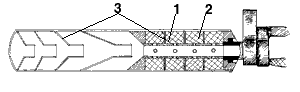Насадка другого типа изобретена Д. Холзером и с 1975 г. выпускается английской фирмой "Тэйлор" (рис. 10). Такая насадка состоит из конуса-раструба (1), внутренний диаметр стыкующейся со стволом части которого равен диаметру канала ствола оружия. Внутренняя часть конуса-раструба подобрана таким образом, что давление вылетающих расширяющихся и отражающихся от стенок пороховых газов значительно ослабевает. Вырвавшись из конуса-раструба они начинают работать по принципу струйного насоса, то есть они подсасывают через каналы (2) атмосферный воздух в трубу (3) корпуса насадки, внутри которой происходит их интенсивное перемешивание и охлаждение, приводящее к смягчению звука выстрела.