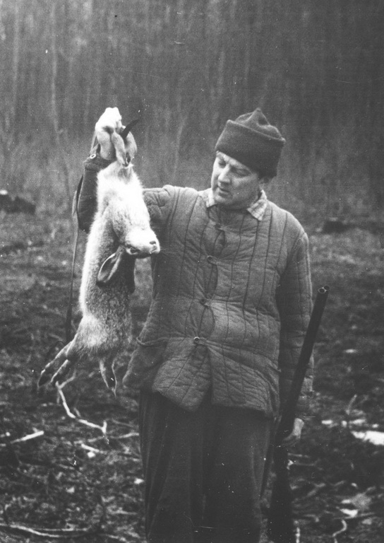Подбегаю к зарослям. Недалеко от их края вижу, на боку лежит, скрестив лапки, большой белогрудый русачина. На мой голос быстро приходит отец, за ним спешит Леонид Алексеевич. Поднимаю за задние лапы «косого». Тяжелый.