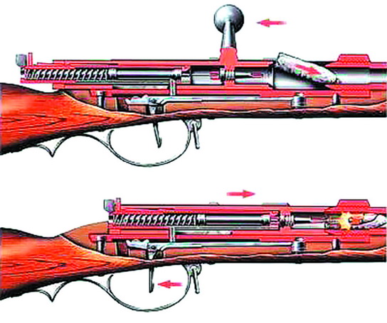А чуть позже появились винтовки с затвором «прямого действия», в которых стрелок был избавлен от необходимости поворачивать затвор вручную для достижения запирания и отпирания канала ствола, так как это осуществлялось специальным механизмом, — для перезарядки было достаточно отвести затвор назад и дослать вперед (винтовка Фердинанда Маннлихера (Ferdinand Mannlicher M1895), винтовка канадца сэра Чарльза Росса 1897 г. (Charles Ross) и другие).
