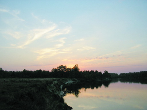 Солнце по дуге опускается к дальним вербам. Пора нам присматривать место для ночлега. Вот приближается справа ровный берег с травянистой поляной. Причаливаем, осматриваемся. Место подходящее, и выносим по песчаному крутояру наши вещи и байдарку наверх. Байдарка весит пуд, и Игорь ее поднимает сам. Наверху травянистое ровное место и стоит одинокая лавочка — доска на двух столбиках, врытых в землю. Бегло осматриваем окрестности. Поодаль, за приречными зарослями стоит заброшенная хата, рядом с ней перекопанный огород, а менее чем в километре белеют хаты небольшого села. Вернувшись на место, ставим палатку. Из рюкзака Игорь, достает легкую печку, сделанную им из двух круглых жестянок. Улыбаясь, говорит, что печка очень экономная, с дожиганием образующейся окиси углерода. Печку устанавливает на треноге около лавочки, на которую мы ставим нашу посуду, выкладываем хлеб и продукты для варки. Готовим быстрый походный ужин: макароны. Заправляем их банкой тушенки. Вскипятив отдельно воду, завариваем желанный чай. В небе половинка луны хорошо освещает берег и поблескивает, отражаясь в речке. Очень тепло. На востоке, вдали темнеет полоса густых туч. Там розовато вспыхивают молнии и доносятся раскаты грома, но гроза проходит мимо.