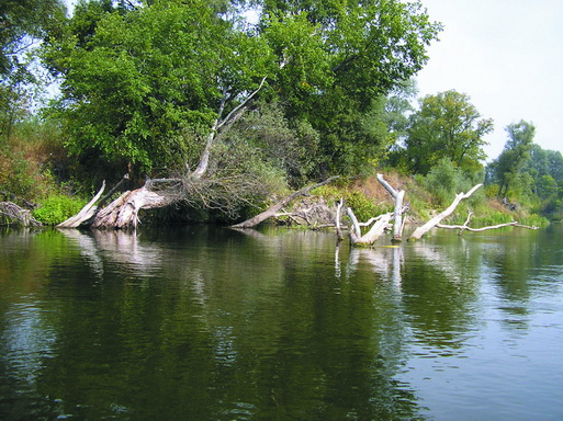 Новое утро распахнуло голубое небо с белыми полосами перистых облаков. Не спеша умываемся и принимаемся за приготовление завтрака. Когда отплыли, солнце уже подошло почти к вершине своего дневного пути. Поворот минуем за поворотом, любуясь речными берегами, поросшими лиственным лесом из высоких ветел, тополей, осин, вязов, ясеней. Всё вокруг залито ярким светом не по-осеннему жаркого солнца. Сентябрь уже украсил позолотой кроны некоторых деревьев под голубым небом, напоминая о приближающейся «золотой осени». У обрывистых, лесистых берегов в воде лежат упавшие деревья. Около них иногда всплескивает крупная рыба, и расходятся круги на воде.