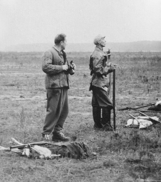 В соседней комнате слышен разговор, горит свет. Пора вставать. Мария Ивановна, жена Владимира Сергеевича, насыпает каждому по полной тарелке горячего рисового супа, густо заправленного сметаной и зеленью петрушки. На дворе темно и зябко. Неширокой, пустынной улочкой идем на станцию. Садимся в электричку, идущую в г. Смелу, и через треть часа сходим в Кошмаке. Белесый рассвет только занимается. Складываем ружья, расходимся полем шагов на семьдесят друг от друга, и наша охота начинается. Тянет холодный ветерок, пошевеливая стебли сухого пырея на обочине, донося запахи влажной земли и увядших бурьянов. Перед глазами потянулась неширокая долина. В ней у посадки белой акации стоит одинокая хата-мазанка с соломенной стрехой, рядом сарайчик-хлев; во дворе стожок сена. Невысокий забор из жердей в три нитки опоясывает небольшой огород с яблоней и парой слив. Хозяев не видно, только пестрые куры ходят в огороде. Пересекаем посадку. Две белочки скачут по земле и взбегают на деревья. Как-то странно видеть их здесь, а не в лесу. Подымаемся из долины. По взгорью, наверху пашня. Земля мягкая, но не вязкая. Вдруг слева звучит выстрел. Останавливаюсь. Стрелял отец. Заяц светло-серым комочком катит прямо от нас уже в шагах полтораста.